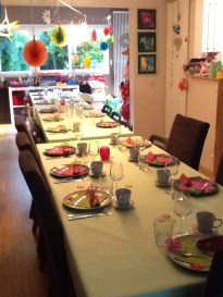 Wegens toch wel beperkte ruimte, nodigden we niet de ‘uitgebreide’ familie (en vrienden) uit: we waren al met 19 personen! Wauw, zou je denken, zo’n groot huis! Maar niets is minder waar: tafels moeten worden verschoven, andere tafels bijgeplaatst en her en der worden stoelen bij elkaar gesprokkeld zodat iedereen toch wel lekker kan zitten. Zitplaatsen worden zorgvuldig uitgekozen: diegenen die vaker naar het toilet moeten en minder mobiel zijn, zitten het dichtst aan de deur richting wc. Diegenen die kleinere kinderen hebben, zitten dan weer aan het andere uiteinde van de tafel zodat ze zicht hebben op en onmiddellijke toegang krijgen tot de tuin.