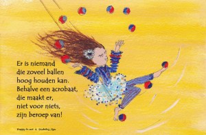 Ik voel me soms zoals een circusartiest, die steeds moet balanceren om alle ballen in de lucht te houden en ondertussen niet mag vallen van de grote bal waarop ze zit. En net zoals bij iedereen is het steeds kiezen welke ballen ik in de lucht gooi en welke ik even opzij moet leggen. Zoekend naar hoe het niet teveel zal worden en op welke manier de andere ballen mooi in de lucht kunnen blijven. Alleen komt dat niet altijd goed uit en is het ook gewoon zo dat er ballen vallen en dus terug (eventueel?) opgeraapt moeten worden.